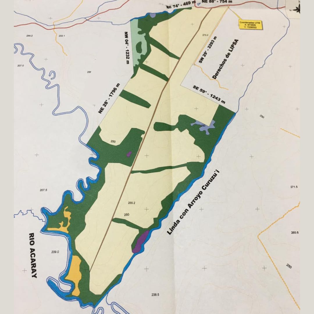 Estancia de 1.040 hectáreas en Itakyry. Departamento de Alto Parana. Tierra roja Con capacidad de plantación en el 80% de la propiedad. El Asfaltado que une Toledo (Caaguazu) con Ytakyry (Alto Parana) va a pasar por una cabecera de la Estancia. Está ubicada a 1.000 metros de un Silo importante. La venta no incluyen las maquinarias. Cuenta con: • Casa. • Galpones. Precio de venta: US$. 7.500.- por hectárea.