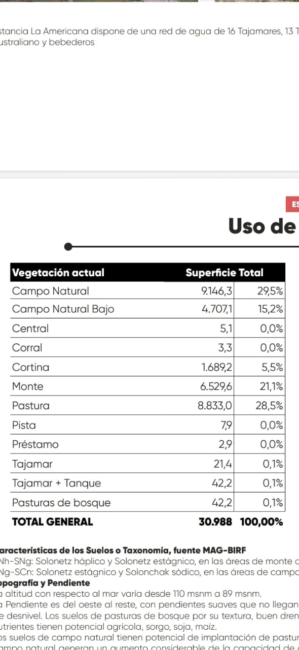 Estancia de 30.988 hectáreas en Fuerte Olimpo. Departamento de Alto Paraguay. Es una unidad de producción, que esta dedicada a la producción ganadera en pasturas implantadas y campos naturales que presenta un atractivo de rentabilidad importante ya que el tamaño y las condiciones ambientales, suelos ricos en minerales y buena pluviometría hacen que se genere economía de escala en cualquier emprendimiento productivo que se haga en él. • Tendido Eléctrico: Se cuenta con el servicio básico nacional • Camino de acceso: los caminos de tierra están bajo la figura de Comisión caminos y mantenido por ellos. • Comunicación: hay alcance de señal de Tigo y Personal. • El Puerto de granos del área de Concepción a 424 km. de distancia. • El Puerto de granos del área de Asunción a 680 km de distancia. • Frigoríficos del gran Asunción están a 680 km de distancia. • Frigoríficos del área de Concepción están a 424 km. de distancia. • Frigoríficos del área de Pedro Juan Caballero están a 638 km de distancia. • Pista de aviación de 1.200 metros. Precio de venta: US$. 900.- por hectárea.