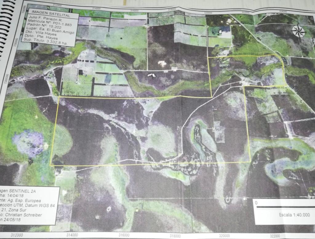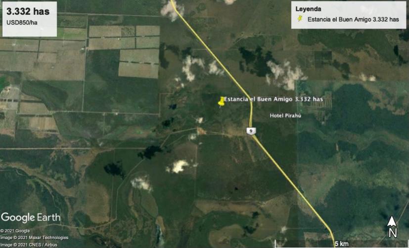 Estancia de 3.333 hectáreas en Villa Hayes, sobre Ruta Transchaco en el Km. 255. Información: • Frente de 2.800 metros sobre ruta. • Cuenta con energía eléctrica monofásica de la ANDE. • El casco principal se encuentra a 2.000 metros de la entrada a la estancia. • Casa principal de 18 x7 metros, con corredor yere, 2 habitaciones con 1 baño moderno, área de living. • Casa pegada a la principal de mismas dimensiones, contando con una cocina comedor, 2 habitaciones con baño moderno y un depósito amplio para provistas. • Casa de personal se encuentra a 30 metros de la casa principal y tiene 6 habitaciones y cocina comedor. • Aljibe de 8.500 litros de agua. • Alambrado perimetral de 5 hilos de alambre de 17/15, con postes de quebracho y 4 balancines intermedios. • Corral de palma, con embarcadero; brete y cepo de lapacho. 4 corrales de aparte y 1 corralón con manga (se pueden manejar 500 cabezas a la vez). • 14 potreros. • 2 tajamares con tanque australiano de 10.000 m cúbicos. • 2 retiros con pequeño corral cada uno. • Riacho 7 puntas atraviesa la propieda. • Tiene estudo de impacto ambiental de la SEAM. Precio de venta: US$. 850.- por hectárea.