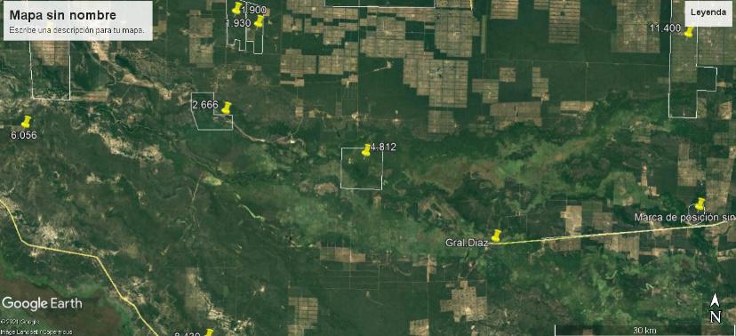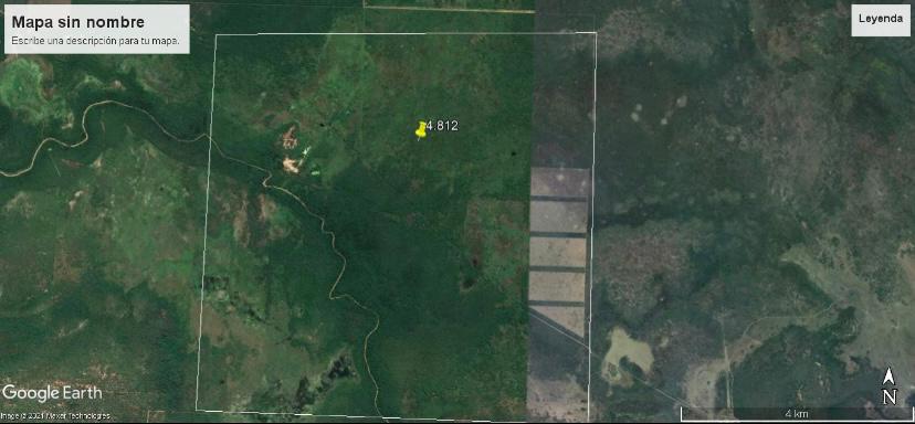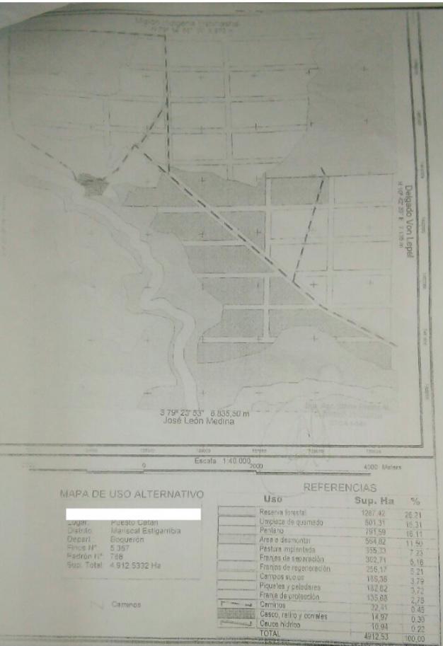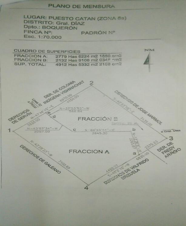 Estancia de 4912 Hectáreas en Linea 32 (Puesto Catan). Boquerón Se halla ubicada en el Departamento de Boquerón, en la zona de General Díaz, sobre un brazo del Río Pilcomayo, se encuentra distante de Asunción a 510 km. por la ruta Transchaco-Pozo Colorado-General Díaz. Otra vía de acceso es por la colonia Neuland-Demattei-Pirizal-Línea 32 (650 km). La superficie total es de 4.912 hectáreas, 5.332 m2 y 2.198 cm2., compuesta de dos fracciones separadas por un camino interno que une Pirizal con General Díaz. • FRACCIÓN A; de 2.779 hectáreas, 5332m2, 2198cm2. • FRACCIÓN B; 2.132 hectáreas, 9108 m2, 0348 cm2 (esta fracción tiene acceso al Río Pilcomayo, ademas posee 3 tajamares). DESCRIPCIÓN DE LA ESTANCIA: • Alambrados perimetrales (a reparar) y tajamares. • Dispone de 1 retiro en la entrada (Ruta a Pirizal). • Cuenta con un corral con toda la infraestructura necesaria (Brete, Cepo, Embarcadero y Corrales auxiliares). • El terreno dispone de 2 partes, separadas por un camino vecinal, con parte baja (bañado) y otra parte alta con abundante pastura natural del tipo clavel. • Dispone de 4 zonas de palmares de gran importancia con palmas coloradas y blancas (útiles para la construcción de corrales y viviendas). • La vivienda se halla provista de un muro perimetral de contención de 100 Has, para casos de desborde del brazo del Pilcomayo. • Casa de capataz y personal de la Estancia, provista de 3 dormitorios, cocina, deposito y baño. • Casa para personal contratista. • Gallinero. • Quincho de 12x6mts (construcción tipo tinglado) con piso de cemento, protección perimetral con postes de palma. • Pozo de agua dulce permanente de 12 metros de profundidad. • Aljibe con capacidad de 30 (treinta) metros cúbicos para abastecimiento de la casa principal. • Tanque de agua con capacidad de 1.000 litros abastecido del pozo de agua dulce. • Tanque de 500 litros abastecido del aljibe. • Pista de aterrizaje de 1.000 metros de largo x 50 de ancho, única pista cargada, compactada y preparada para su uso en cualquier época del año o condiciones climáticas, con capacidad para aterrizaje de Aviones pequeños o grandes (tipo DC3 Douglas). • Capilla equipada para albergar a un máximo de 30 personas, totalmente hecha de madera prefabricada (machimbre 9 y techo de Zinc). • Chacras y plantaciones frutales y hortícolas. • Cuenta con 500 Has de pastura implantada tipo Gatton Panic, 7 Tajamares de los cuales 4 soncon tanque Australiano. CARACTERISTICAS DEL RÍO: Dispone de agua casi todo el año, en época de crecida el cauce presenta una profundidad de hasta 3,50mts, dotado de abundantes peces y animales silvestres (Yakaré, Carpincho, Venado, Cerdos salvajes, Ciervos y otros). La propiedad presenta la particularidad de contar con agua aún en las peores sequías registradas en la región (con tajamares y pozos de agua dulce). Precio: US$. 550.- por Hectárea.