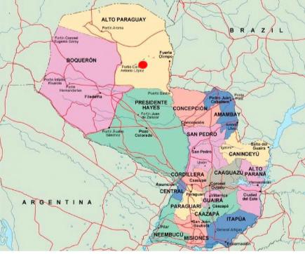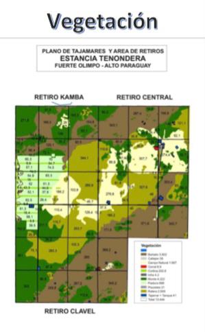 Estancia de 13.444 hectáreas en Fuerte Olimpo. Departamento de Alto Paraguay. La estancia está ubicada en el Departamento de Alto Paraguay, Distrito de Fuerte Olimpo, lugar denominado Fortín Torres. Acceso al Establecimiento Se accede al inmueble por la ruta que une Filadelfia – Tte. Montanía – Parque Nacional Defensores del Chaco, tomando la ruta que se dirige a Fuerte Olimpo en el cruce Pitiantuta, conocido también como Ultimo Trago. Está ubicada aproximadamente a 230 Km de Filadelfia. Esta ruta es de todo tiempo para vehículos livianos y cuenta con mantenimiento permanente a través de la comisión de camino que se encarga del manejo de las barreras en casos de lluvia para camiones de gran porte y del cobro del peaje correspondiente. Desde Loma Plata existen similares condiciones y posibilidades de acceder a la propiedad, a través de rutas tipo Menno de todo tiempo con peaje, pasando por Colonia Las Palmas, siendo la distancia hasta Tenonderá de aproximadamente 220 Km. También se puede acceder desde la zona de Toro Pampa por el antiguo camino público y por diversos caminos privados. Puede conectarse con línea 1, que comunica la zona de Agua Dulce con Bahía Negra a través de la ruta que baja a Toro Pampa. Actualmente se encuentra en construcción con toda celeridad la ruta BIOCEANICA, que beneficiará notablemente el acceso a la propiedad. Distancia a centros urbanos - Asunción a Tenonderá: 673 Km. - Filadelfia a Tenonderá: 230 Km. - Loma Plata a Tenonderá: 220 Km. - Carmelo Peralta a Tenonderá: 200 Km. - Fuerte Olimpo a Tenonderá: 140 Km. Descripción del área y el clima. La vegetación boscosa característica del inmueble es de bosque abierto semidecíduo xerófito, donde predominan el quebracho colorado, quebracho blanco, palo santo y matorrales xerófitos como guaigui piré, karanday, pata de monte entre otros. Las precipitaciones de la zona promedian los 1.500 mm. al año, con concentración de las mismas en los meses de octubre-mayo, con mayor intensidad entre diciembre y febrero. La temperatura media anual oscila los 26° C, con mayores temperaturas entre octubre y marzo y descenso de la temperatura entre abril y setiembre. Los vientos predominantes en el verano son del sector norte-noroeste, asociados a sistemas de baja presión de aire caliente y lluvias y los vientos de invierno predominan del sector sur-sureste, con sistemas de presión alta. La propiedad posee excelentes características para la implantación de pasturas de elevada producción forrajera de buena calidad, como Gatton Panic, Tanzania, Mombaza y otros, así como para implantación de pasturas sobre campo natural y palmar, siendo las especies más recomendadas el Pangola y Tangola para el palmar y para el campo natural intermedio diferentes variedades de Grama Rhodes. Asimismo, los suelos de montes presentan características excepcionales para cultivos agrícolas debido a la calidad mineral del suelo sumado al régimen pluviométrico. Infraestructura 1. Uso de suelo: • Superficie total: 13.444 Has. • Campo natural: 1.667 Has. • Monte: 4.222 Has. • Areas de pastura: 868 Has. • Área a intervenir para implantación de pasturas: 4.500 Has. 2. Infraestructura General: • Alambrado perimetral: 47 km. • Alambrado interno: 150 km. • Tajamares con tanques australianos: 15 ( total : 221.000 m3). • Tajamares con acceso directo: 10 (total: 100.000 m3). • Bebederos de 1.000 litros: 10 unidades. • Bebederos de 10.000 litros: 11 unidades. • Corral principal: 1. • Corrales en retiros: 2. • Caminos internos levantados: 18 km. • Caminos internos raspados: 12 km. • Camino perimetral: 28 km. • Pista de aviación: 1.200 m. • Corralones levantados en zona de palmar: 5 unidades. 3. Casco Principal: • Vivienda principal: 5 dormitorios, 4 baños, estar- comedor, cocina, 6 AA . • Vivienda encargado: 2 dormitorios,baño, cocina, estar-comedor. • Vivienda personales: 8 construcción de palma,piso de hormigón,dos habitaciones, estar-comedor, cocina. • Tinglado de 264 m2. • Oficina - escritorio. • Caseta para generador. • Generadores: Olympian 45 KVA. Deustz 20 KVA. • Depósito para combustible de 13.500 litros. • Caballeriza. 4. Retiros : • 1 con construcción de palma, dos habitaciones, estar –comedor, cocinay baño. Precio de venta: US$. 700.- por hectárea.