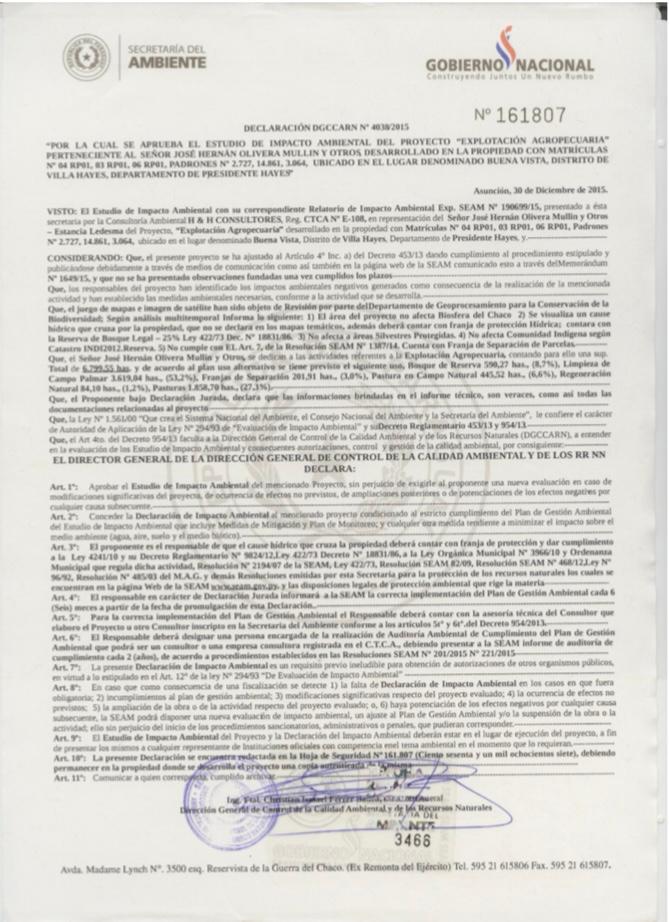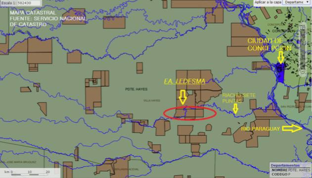 ESTANCIA LEDESMA Superficie: 6.790 hectáreas. Acceso: 360 km. desde Asunción por ruta asfaltada (RN PY 09 y RN PY 05) y 15 km. de camino vecinal (por Estancia Maroma) de tierra. A 55 km. de la ciudad puerto de Concepción. Ubicada en el Departamento de Pdte. Hayes, distrito de Loma Pora. Cruzada por el riacho 7 puntas (más de 5 km.) con puente para camiones de gran porte. Titulo de la propiedad: en orden, inscripto en catastro. • Pista: de 1.200 metros. • Electricidad: cuenta con electricidad monofásica de Ande, con Trasformador en el Casco, y con Transformador en el retiro. Parque Central. • Linderos: Materializado con alambrada perimetral de 5 hilos, en buen estado, más de 130 km. de alambrado, entre lindero y alambrado interno. Terreno plano, característico de la región chaqueña conformado por pasturas implantadas (Tanzania, Humidicola, Estrellita, Mombaza). • Montes (Quebracho colorado, Guayacán) y campo de pastura natural con palmares (Karanday) y bañado. • Potreros: 58 (39 potreros de pastura implantada y 19 poteros de campo natural) • Tajamares: 31 y 4 pozos artesianos de agua dulce. • Pastura implantada: 2.400 Has. de Tanzania excelente, dividido en 37 potreros con agua, más 100 Has. de humidicola-estrellita dividida en 2 potreros. • Campo natural: 3.900 Has. en 19 potreros, con agua. Con permiso para desmonte de 3600 Has (ver foto). • Bañado: 350 Has. aprox. Construcciones: • Casco central: Pozo artesiano. Luz de Ande. Vivienda para visitas, con baño y veterinaria. • Vivienda principal, con baño, cocina, comedor, dos habitaciones, sala y estar. • Vivienda de administrador, con baño, cocina-comedor- estar, dos habitaciones y parrilla. • Cuadra para personal, con galería, cocina, despensa, y tres dormitorios. • Galpón para guarda de equipos y maquinarias, tres habitaciones para solteros. Aljibe. Todas las construcciones del Casco, con techo de chapa de zinc. Caballeriza. Lechería. Corral de ovejas. • Corral para vacunos para 1.000 animales aprox., con Brete, casilla de operaciones completa y bascula techados, y embarcadero. • Molino de tajamar y molino de pozo artesiano proveen de agua corriente. • Retiro I (Bella vista): Vivienda para retirero, con dos piezas dormitorio, una cocina y un depósito. Construcción de madera, con piso de ladrillos y techo de tejas. Baño moderno de material. Corral para 1000 vacunos aprox., con brete, casilla de operaciones techada, y embarcadero. • Retiro II (Parque central): Vivienda para retirero, con dos piezas dormitorios, una cocina y un depósito. Construcción de madera, con piso de ladrillos y techo de zinc. Baño moderno de ladrillos. Luz de Ande. • Corral para 400 vacunos, con brete y embarcadero. Precio de venta: US$. 1.200.- por hectárea.