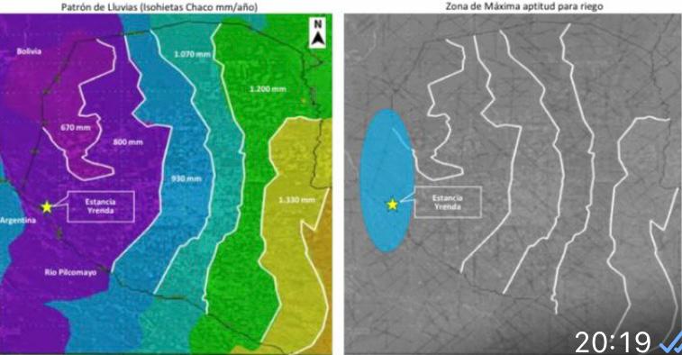 Se vende Estancia de 10.000 hectáreas, en zona Pedro P. Peña. Departamento de Boquerón. Paraguay. Establecimiento Agrícola Ganadero, con Riego, con 3.000 metros de costas sobre el Río Pilcomayo. Ubicada en el Departamento de Boquerón. Zona San Agustín a 230 km. de Neuland, a 55 km. de la futura ruta Bioceánica (cruce Don Silvio), a 700 km. de Asunción. Descripción: 6.070 hectáreas desmontadas a lamina, distribuidas de la siguiente forma: • 850 Has. mecanizadas para agricultura de secano (sorgo, soja, maíz, algodón, otros) • 102 Has. mecanizadas con 85 hectáreas bajo riego de pivote. • 5.118 Has. pasturas de Gatton Panic, Tanzania, Mombaza, Convert HD 365 y Urochloa 3.930 hectáreas de Monte Virgen. • Alambrados: 60 km. Perimetral (5 hilos), 100 + km. interno (4 hilos) y 8 km. eléctricos. Potreros: 42 Potreros desde 50 Has. + 16 Potreros de 5 Has. bajo riego. Tajamares: 3 tanques de 30.000 metros cúbicos c/u. Pozos: 6 pozos artesianos • De riesgo de 220.000 litros/hora (300 metros en 12”) • 2 Auxiliares de 70.000 litros/hora (300 metros en 10”) • 3 Ganaderos de 15.000 litros/hora (solar 200 metros en 6”). Corral: 2 Corrales en lanceado de madera dura con techo, luz, bascula y cepo (uno en la central y otro en el retiro) Corralones, cañería y bebederos: Corralones 100 x 100, con bebederos de hormigón de 10.000 litros conectados a red de cañería principalmente de 3” y algunos de 2”. Casas: Cuenta con Viviendas y Tinglado central, Tinglado con Casas: Cuenta con Viviendas y Tínglado central, tinglado con Viviendas agrícolas y retiro con Viviendas. Caminería: 60 + km de Caminería interna. Precio de venta: US$. 1.200.- por hectárea.