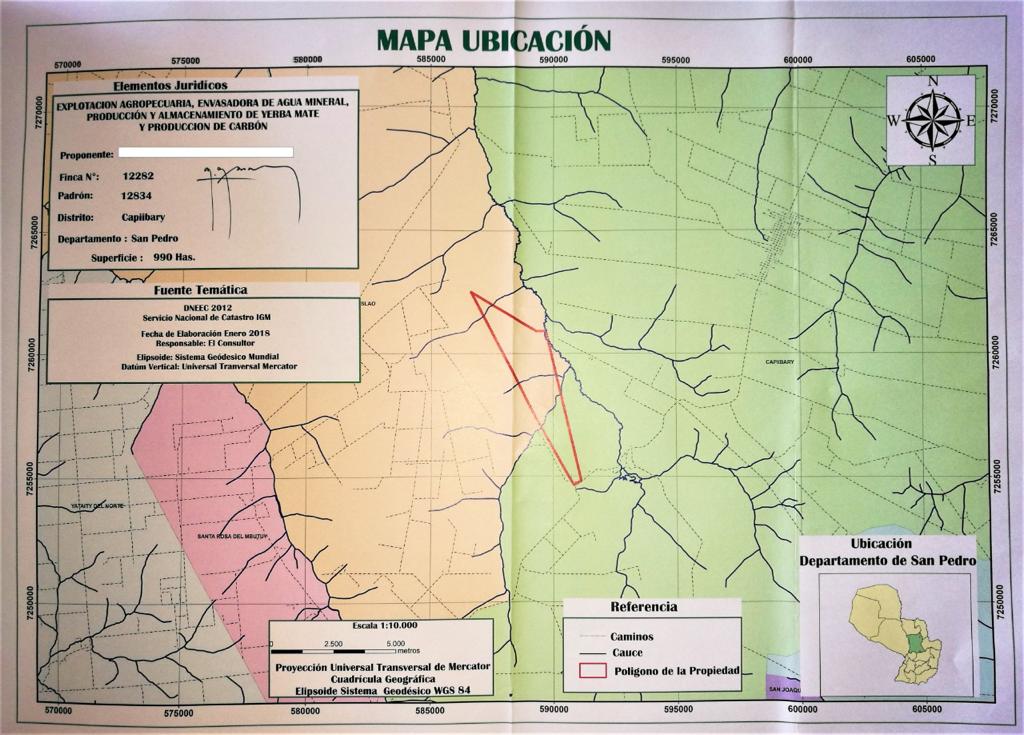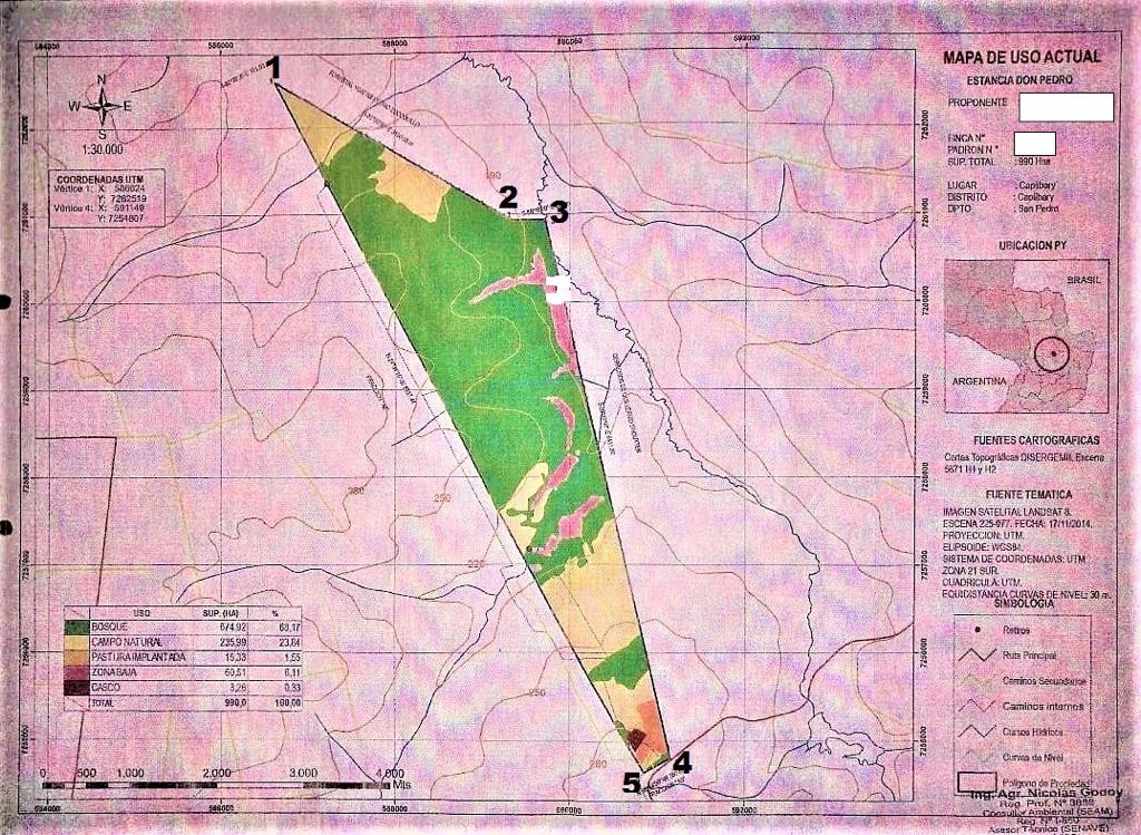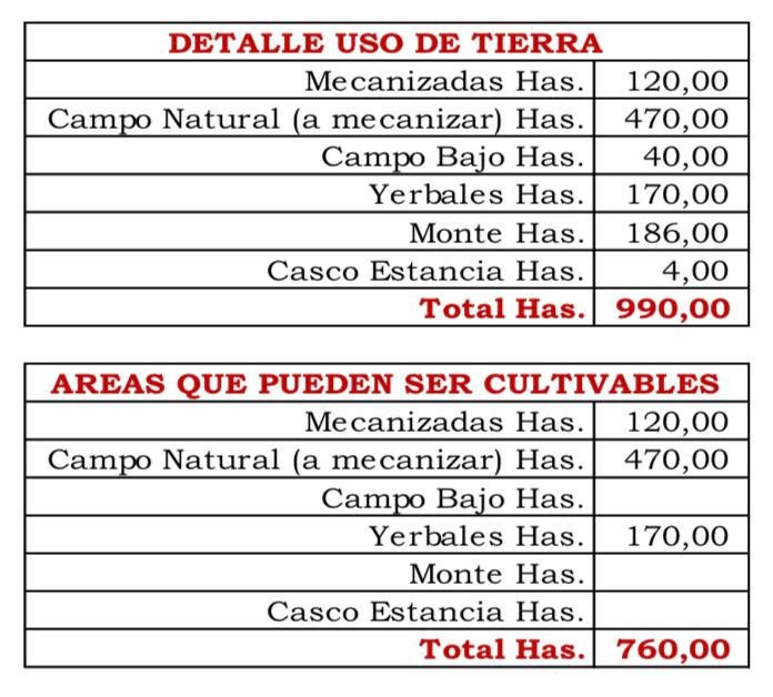 Estancia de 990 hectáreas en el Distrito de Capiíbary. Departamento de San Pedro Dedicada a la explotación del ciclo completo, cría, recría y terminación de machos y hembras descarte, paralelamente se cosechan, procesan y empaquetan las hojas de Yerba mate. Cuenta con energía eléctrica (ANDE). Tendido trifásico. Señal de telefonía celular, Internet. Servicios higiénicos y sanitarios de fuente propia. Dista 95 Km de San Estanislao y 98 Km de Coronel Oviedo, localidades que cuentan con todos los servicios. Tiene Plan de Uso de la Tierra Explotación Agropecuaria, Producción y Almacenamiento de Yerba Mate y Otros, aprobado y vigente según Declaración DGCCARN No 1748/2015 de fecha 27/Noviembre/2015. Mejoras: • Pasturas: 630 Has. de Brach, MG5, estrella, Brizantha, Colonial, terrenos desmontados a mano (rozado), posteriormente hilerados a máquina, buena condición. • Área Mecanizada: 100 Has destroncadas, niveladas y habilitadas para utilización de maquinaria agrícola. • Camerún/Caña de Azúcar: 30 Has. destroncadas, niveladas y habilitadas para forraje de corte. • En el borde de monte, se encuentran 13.000 plantas de yerba mate. • Alambradas: Convencionales, 4 y 5 hilos lisos, postes de madera dura c/5 m, 3 balancines intermedios, buena condición. Perímetro: 20,6 Km, Internos: 17,9 Km. • Aguadas: 1 tajamar/represa de 12.000 m3. 3 tajamares, totalizando 13.000 m3 de excavación. En la sede, con un pozo artesiano c/tanque de fibrocemento de 10.000 lts, cañerías, bebederos. La fracción se encuentra afectada por varios arroyos y cauces secundarios. • Caminos Internos: 20 Km. de terraplén cargado, incluyen Perímetro y callejón central. 2 puentes de madera en buen estado. • Electricidad: 3 Km de tendido trifásico, columnas de hormigón. • Construcciones: Vivienda de 130 m2, 2 dormitorios, cocina, baño, galería. Piso y paredes de material cocido, aberturas de madera, techo de chapas. • Galpón p/procesamiento de yerba mate de 450 m2, piso y paredes de madera, techo de chapas c/cielorraso de pino. En su interior se encuentra el secador/sapecador (barbacuá), molino c/motor de 15 HP, báscula fija y la empacadora. • Corral: 40 m x 40 m. Lances de madera aserrada, horcones de urundey, bretes, cepo, báscula techados (120 m2). 4 apartes, embarcadero. • Electricidad: 5 Km de tendido trifásico, columnas de hormigón, transformador de 50 KvA, conexiones e instalaciones complementarias. • Construcciones: Vivienda Principal de 150 m2, 3 dormitorios, cocina, baño, depósito, Vivienda del Capataz/Personal de 500 m2, 6 dormitorios, baño, cocina, galería. Galpón/Depósito de 100 m2, piso de ladrillo, paredes de ladrillos y tablas, techo de chapas.- Gallinero de 100 m2, Porqueriza de 25 m2, Galpón p/carro de 15 m2, Galpón p/maquinarias de 360 m2, piso alisado de cemento, techo de chapas. En su interior están instaladas 3 picadoras de forraje. DETALLE USO DE TIERRA • Mecanizadas Has.: 120,00. • Campo Natural (a mecanizar) Has.: 470,00. • Campo Bajo Has.: 40,00. • Yerbales Has.: 170,00. • Monte Has.: 186,00. • Casco Estancia Has.: 4,00. Total Has.: 990,00. AREAS QUE PUEDEN SER CULTIVABLES • Mecanizadas Has.: 120,00. • Campo Natural (a mecanizar) Has.: 470,00. • Campo Bajo Has. • Yerbales Has.: 170,00. • Monte Has. • Casco Estancia Has. Total Has.: 760,00. Precio de venta: US$. 3.500.000.- (IVA Incluido). Se puede financiar: Entrega: 2.000.000.- 1er. año: 500.000.- 2do. año: 500.000.- 3er. año: 500.000.-